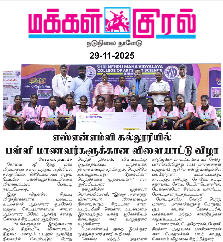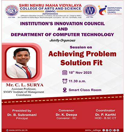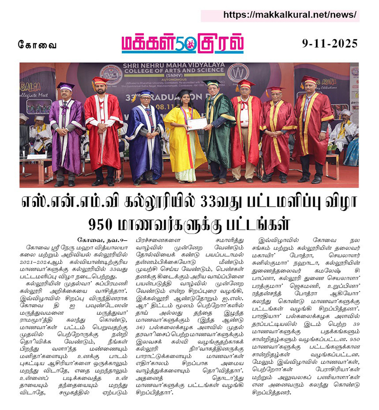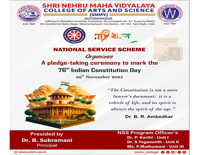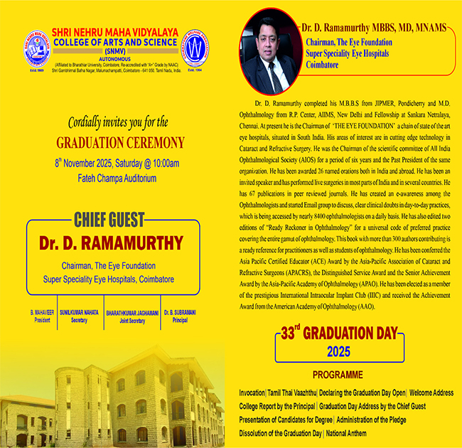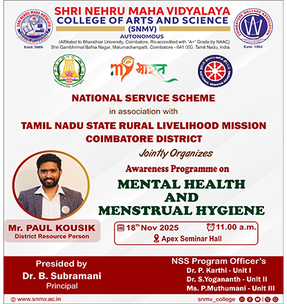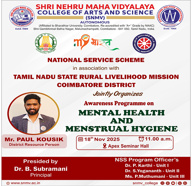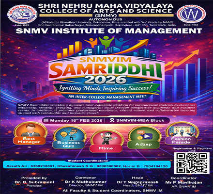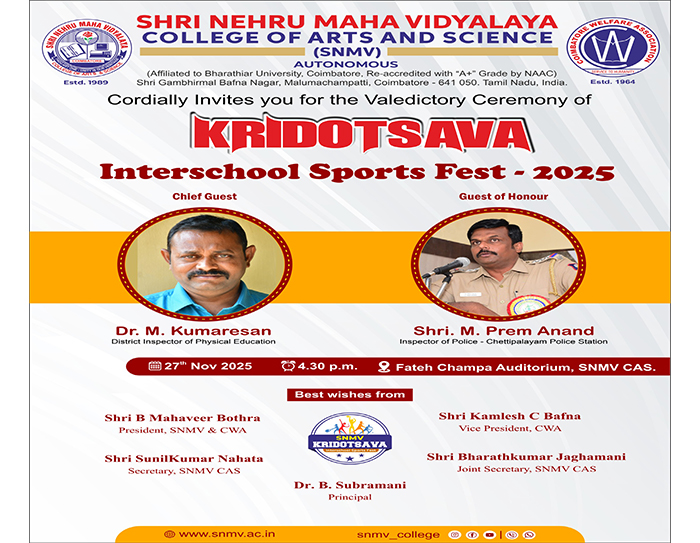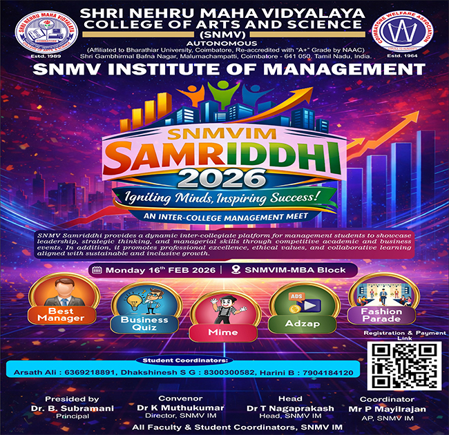 Shri Nehru Maha Vidyalaya (SNMV) College of Arts & Science was promoted in 1989, the silver jubilee year of CWA (Coimbatore Welfare Association). It is located in a serene campus of 50 acres at Malumachampatti, near the famous Eachanari temple on Coimbatore-Pollachi national highway.