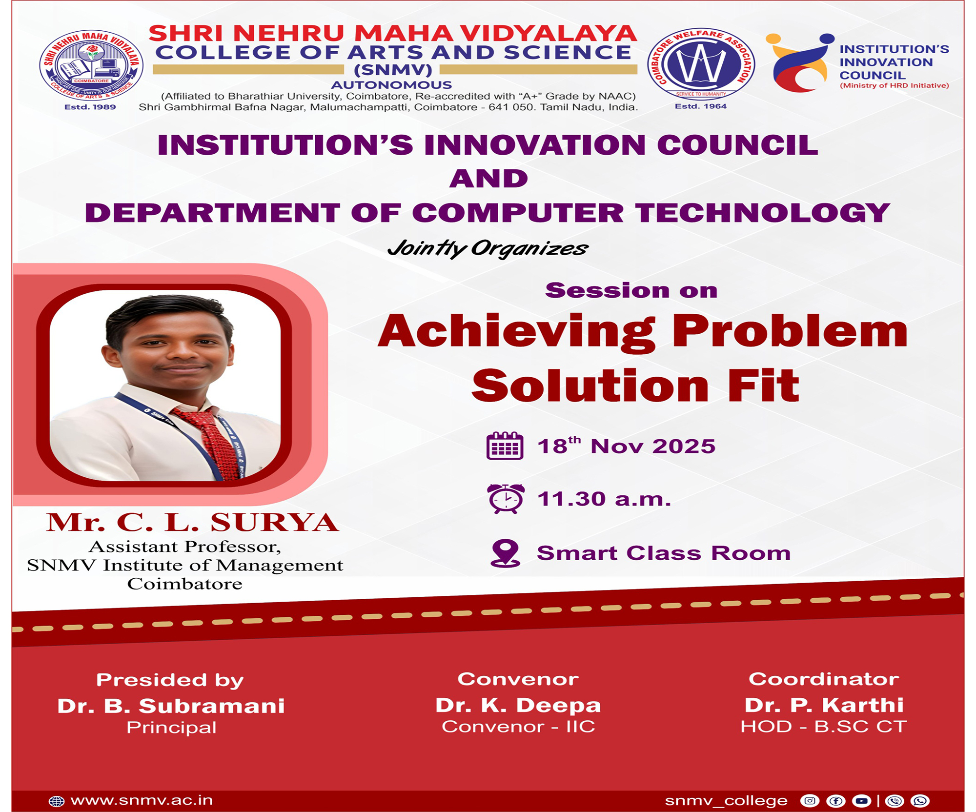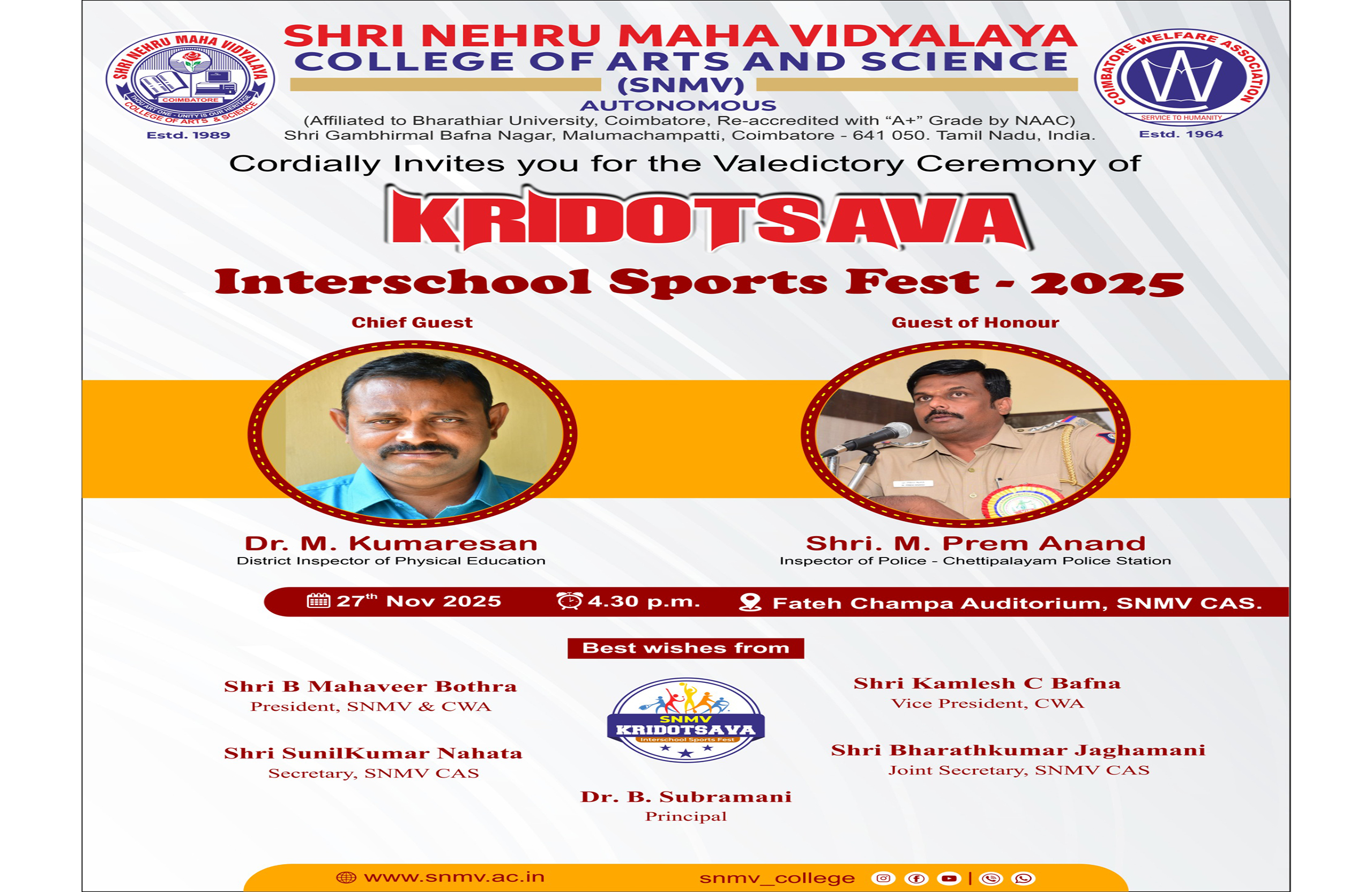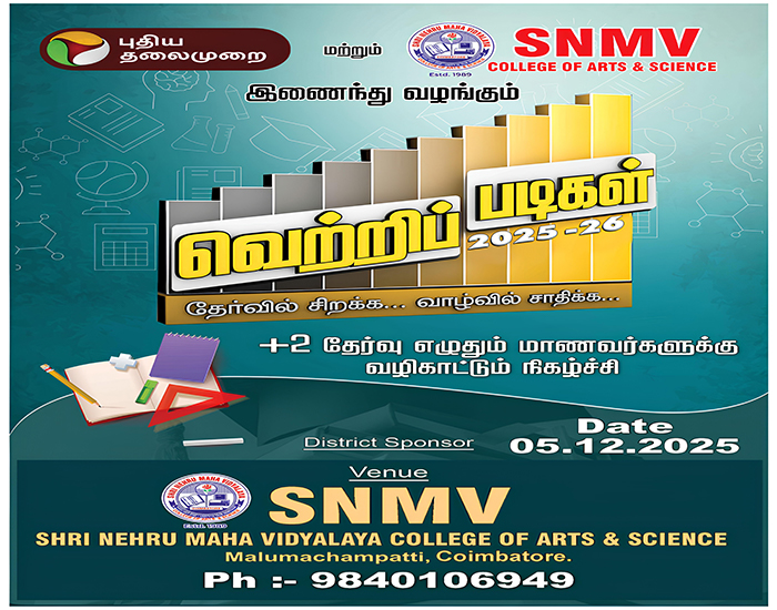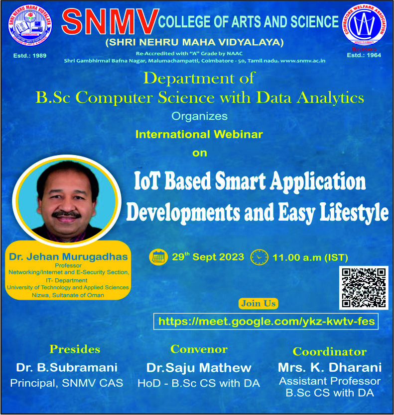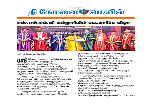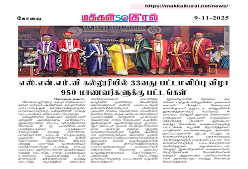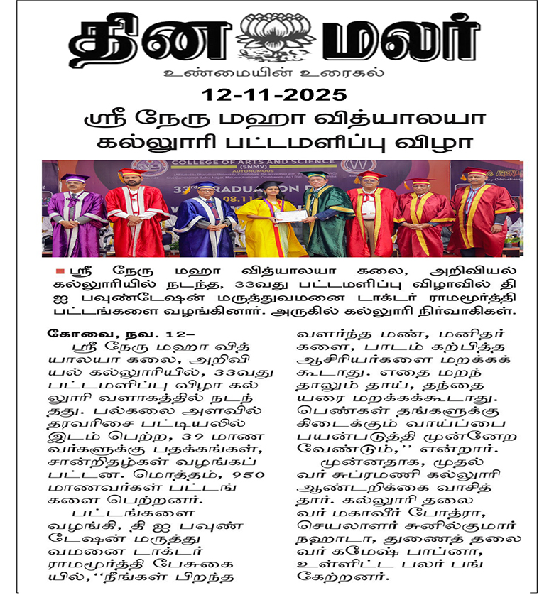 Shri Nehru Maha Vidyalaya (SNMV) College of Arts & Science was promoted in 1989, the silver jubilee year of CWA (Coimbatore Welfare Association). It is located in a serene campus of 50 acres at Malumachampatti, near the famous Eachanari temple on Coimbatore-Pollachi national highway.