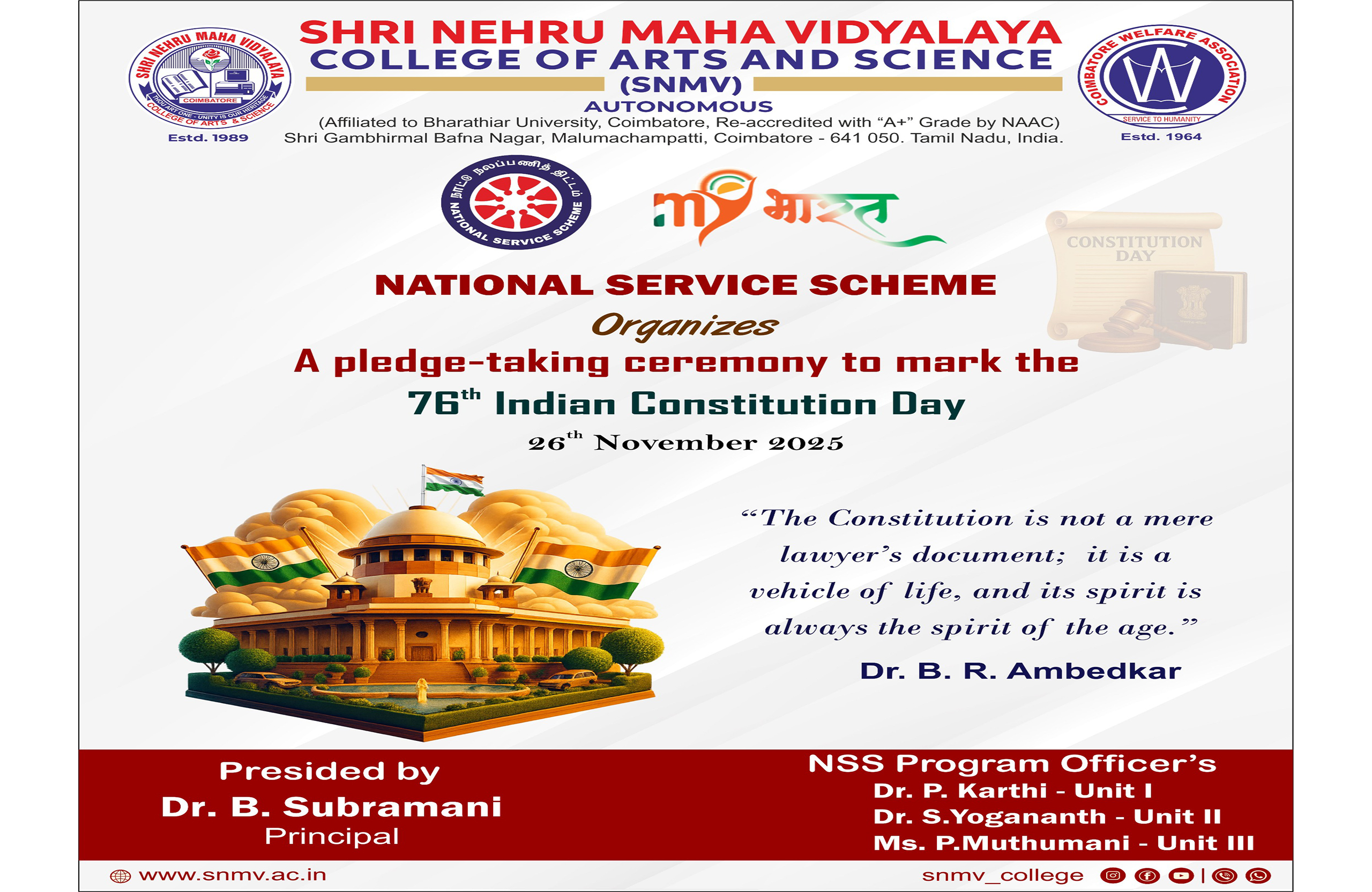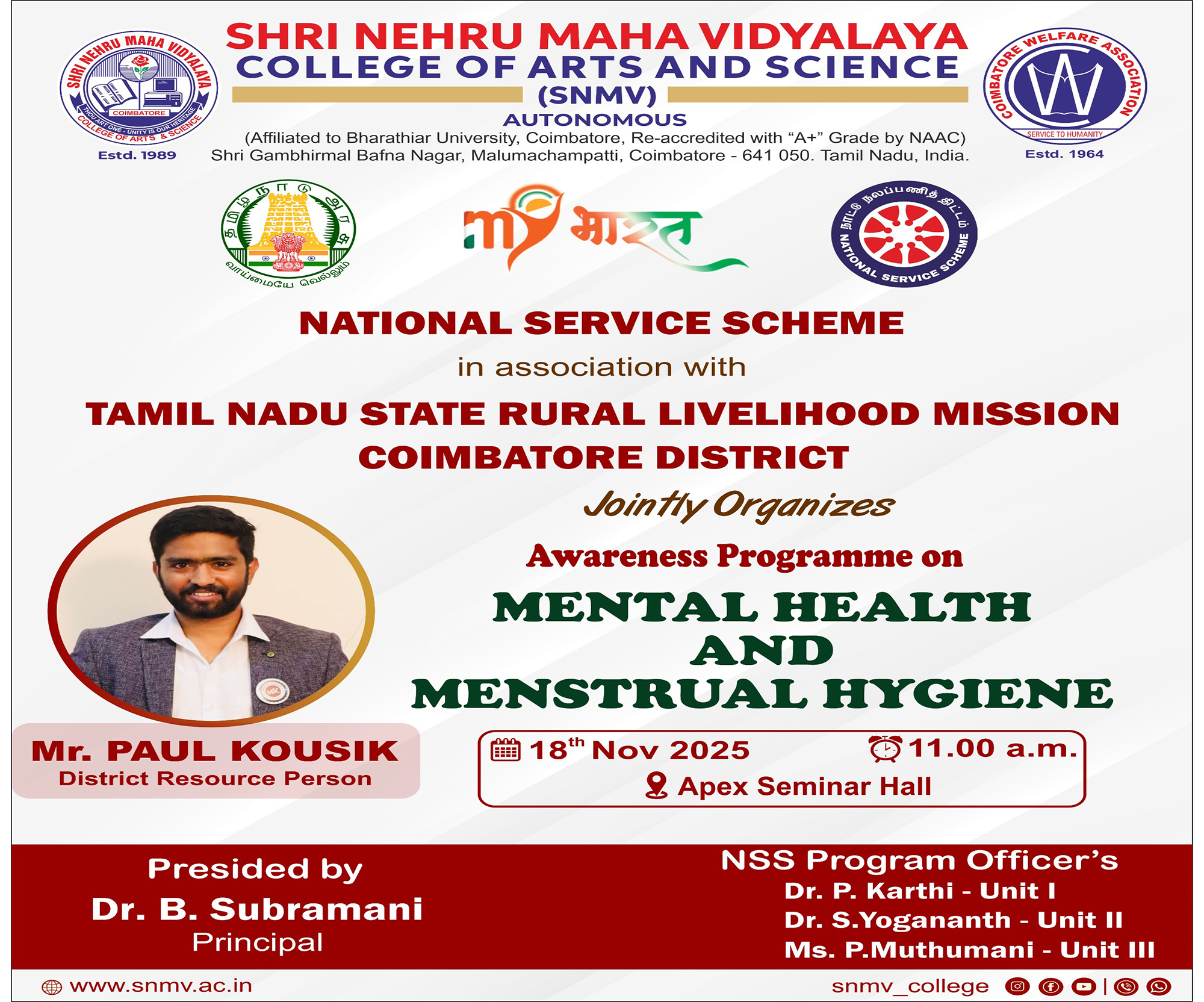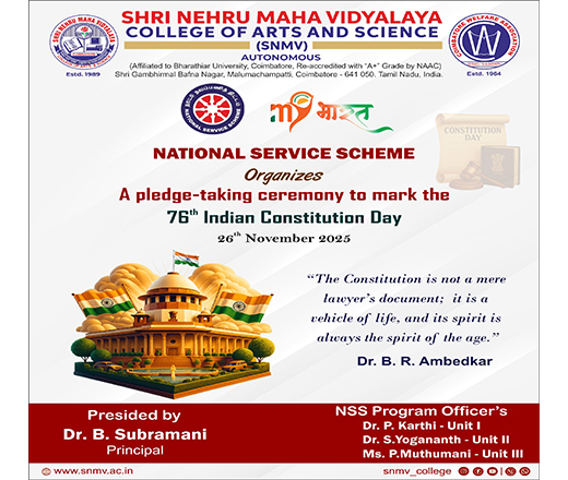 The aim of Shri Nehru Maha Vidyalaya (SNMV) is to promote student development through value based education. The college strongly believes in enhancing the positive growth of youth in order to establish them as citizens who can make the world a better place. It also aspires to foster the development of the myriad cultures and traditions that India proudly nurtures. On the whole, the college intends to ensure that any student, who enters its portals, emerges holistically and socially capable.