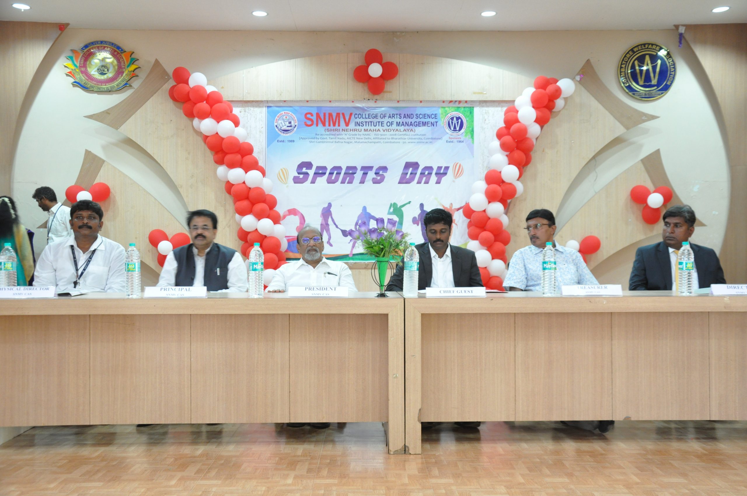 The Chief Guest, in his special address, emphasized the importance of sportsmanship and urged the youth to embrace resilience in the face of challenges and setbacks, as it is the true path to success. Dr. R. Bhakyaraj, Head, Department of Microbiology, delivered the Welcome Address, while Mr. G. Sadeesh Kumar, Physical Director, SNMV CAS, presented the Annual Sports Report 2024–2025, highlighting the achievements of the Physical Education Department. The winners of various competitions, including Table Tennis, Running Race, Carrom, and Chess, were honored with prizes and certificates by the dignitaries. The Overall Rolling Trophy was bagged by the Blue House. The celebration concluded with a Vote of Thanks delivered by Dr. K. Muthukumar, Director, SNMV Institute of Management. The day turned out to be a grand success with the spirited participation of students.