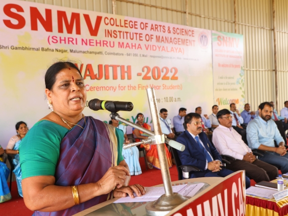 Shri Nehru Maha Vidyalaya College of Arts and Science conducted the Induction Ceremony, Swajith 2025, to Welcome the first-year UG students on 2nd July 2025. Dr. B. Subramani, Principal, SNMV CAS, welcomed the gathering and highlighted the facilities and achievements of the college, such as producing high university ranks under Bharathiar University, being ranked among the top 10 colleges in Tamil Nadu, and providing platforms like NSS, NCC, IAS Academy, hostel facilities, and various club activities. A notable achievement of the college is the provision of 36 free seat allotments to students who have lost their parents.