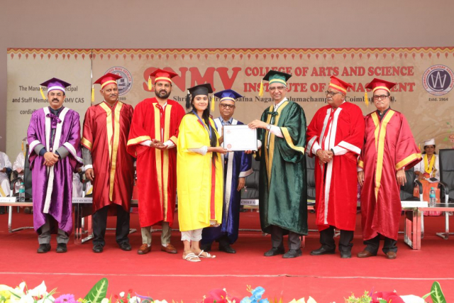 Shri Nehru Maha Vidyalaya College of Arts and Science (SNMV CAS) successfully hosted its 33rd Graduation Day on the college campus at Malumachampatti, Coimbatore, celebrating the academic accomplishments of the graduating batch of 2021–2024. The ceremony was graced by the esteemed Chief Guest, Dr. D. Ramamurthy, Chairman of The Eye Foundation, Coimbatore, and a globally renowned Ophthalmologist. He delivered an inspiring and thought-provoking address, motivating the graduates to pursue excellence and integrity in their professional journeys. The college’s top achievers, including 39 University Rank Holders, were honored by the Chief Guest and the college management for their outstanding academic performance.