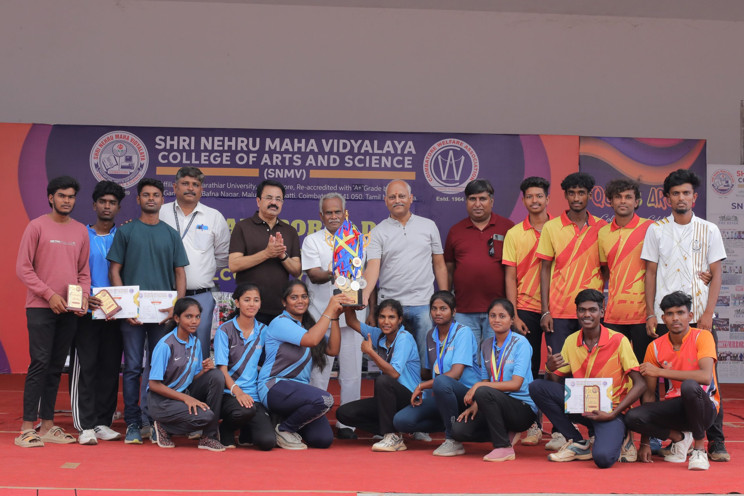Shri Nehru Maha Vidyalaya College of Arts and Science celebrated its Annual Sports Day with great enthusiasm and inspiring zeal on 22nd March 2025. The Chief Guest, Dr. S. T. N. Rajeshwaran, Director of Physical Education (i/c), Bharathiar University, Coimbatore, hoisted the National Flag and lit the Olympic torch, marking the beginning of the celebration. Shri Bharathkumar Jagamani, Joint Secretary, SNMV CAS, formally declared the Sports Meet open. The inaugural session was followed by an oath-taking ceremony and a spectacular march past by the students of SNMV.